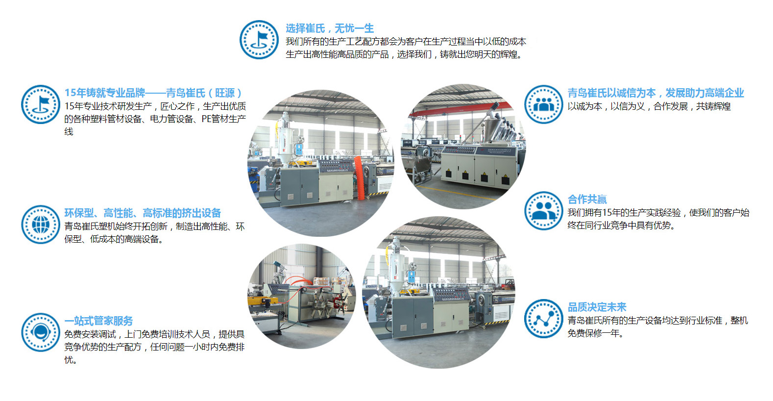 青島崔氏塑料機械有限公司始終以開拓創(chuàng)新的精神,緊跟世界塑機行業(yè)的發(fā)展趨勢,專注研發(fā)與生產(chǎn)預應力波紋管全線設備,公司已有20多年的生產(chǎn)與實踐經(jīng)驗,在市場大環(huán)境下,緊跟國家發(fā)展趨勢,使我們的客戶在市場競爭中有一席之地,人生就是不斷決定的過程、決定沒有對與錯,只有得與失!選擇崔氏我們定不負卿。